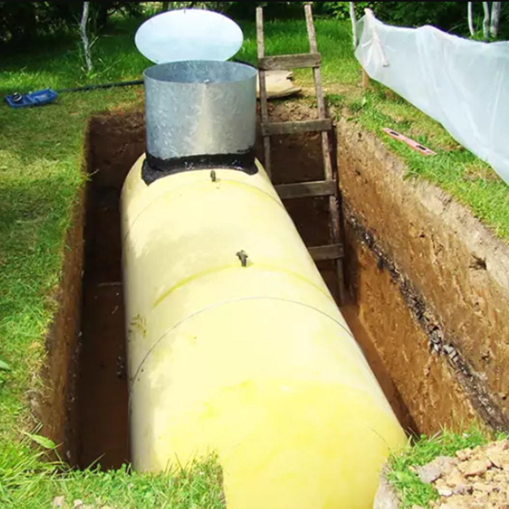 - Подземный монтаж. Этот способ подходит для дачи. Емкость скрывается под землей, она не занимает свободного пространства на участке. Подземное размещение не снижает долговечности емкости, она прослужит несколько десятков лет.